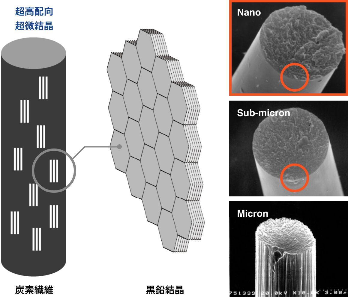第3世代炭素繊維では、繊維構造をナノレベルで制御する焼成技術を用いることで、強さと硬さを同時に高めることを実現しました。そこで誕生したのが、高強度タイプのT1100Gです。