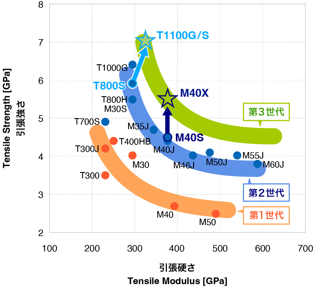 第3世代炭素繊維とは、技術的な難易度が高いとされてきた強さ(強度)と硬さ(弾性率)を高次元で両立した素材です。炭素繊維の強さと硬さは、一方が高まればもう一方が下がる、というトレードオフの関係にあります。